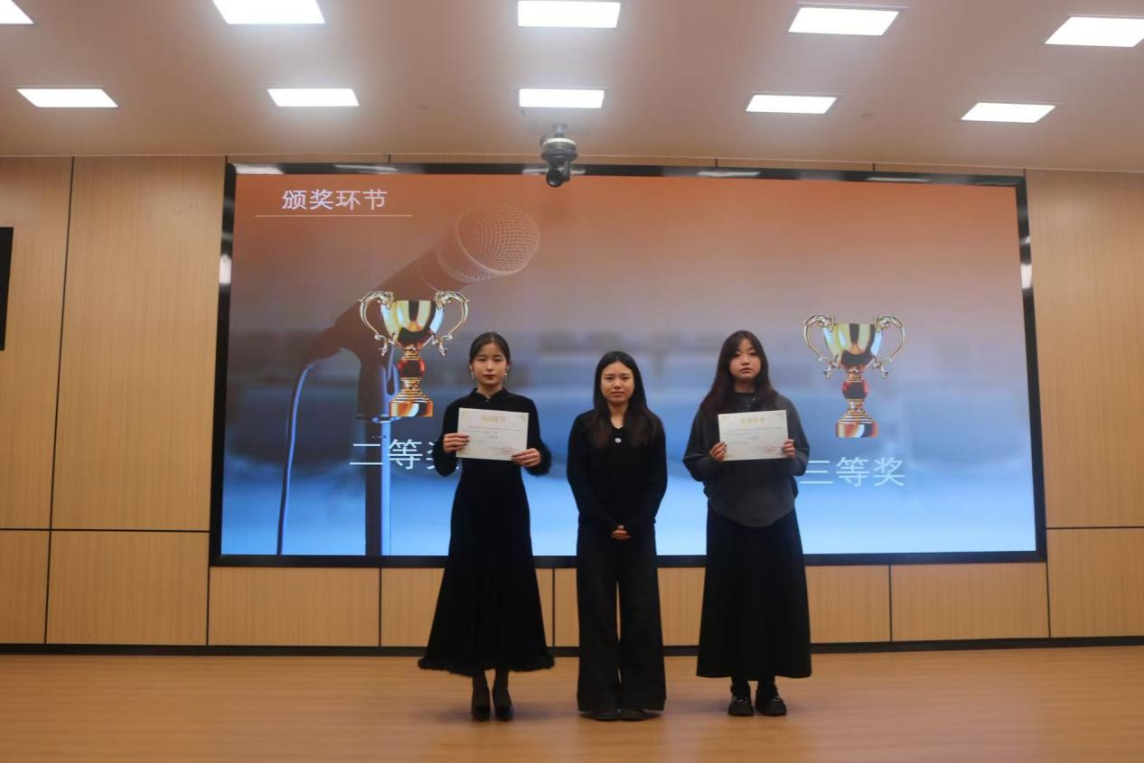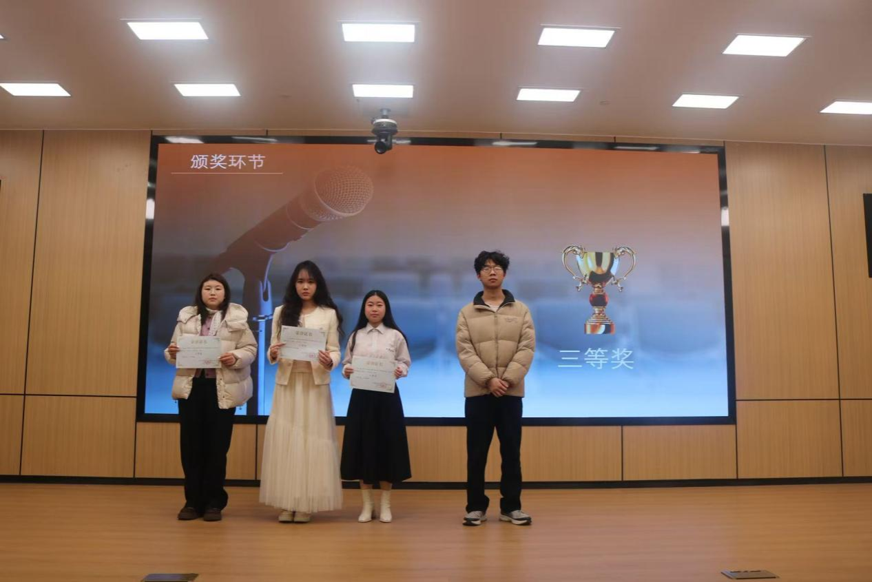 随着模拟主持环节的落幕,本次金话筒主持人大赛的获奖名单正式公布:一等奖获得者为李哲涵同学,二等奖获得者为刘芯邑和王瑞雪同学,三等奖获得者为胡心语、李雨昕和关雅晴同学,优秀奖的获得者为辛颖、张宇宁、徐依琳和金一晴同学。随后,任素伟老师和团学会主席团的学长学姐们依次为获奖选手颁发荣誉,并与大家合影留念。