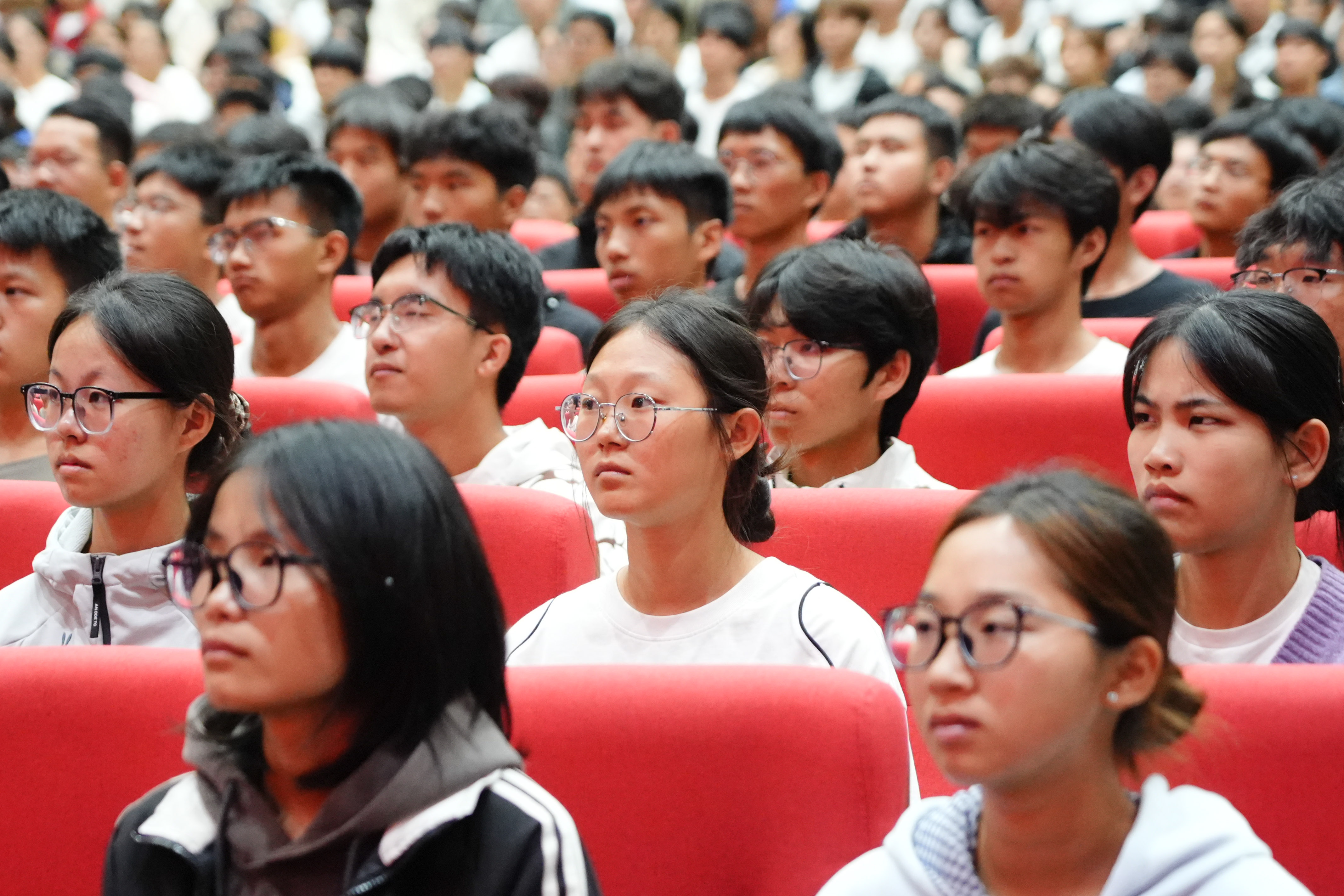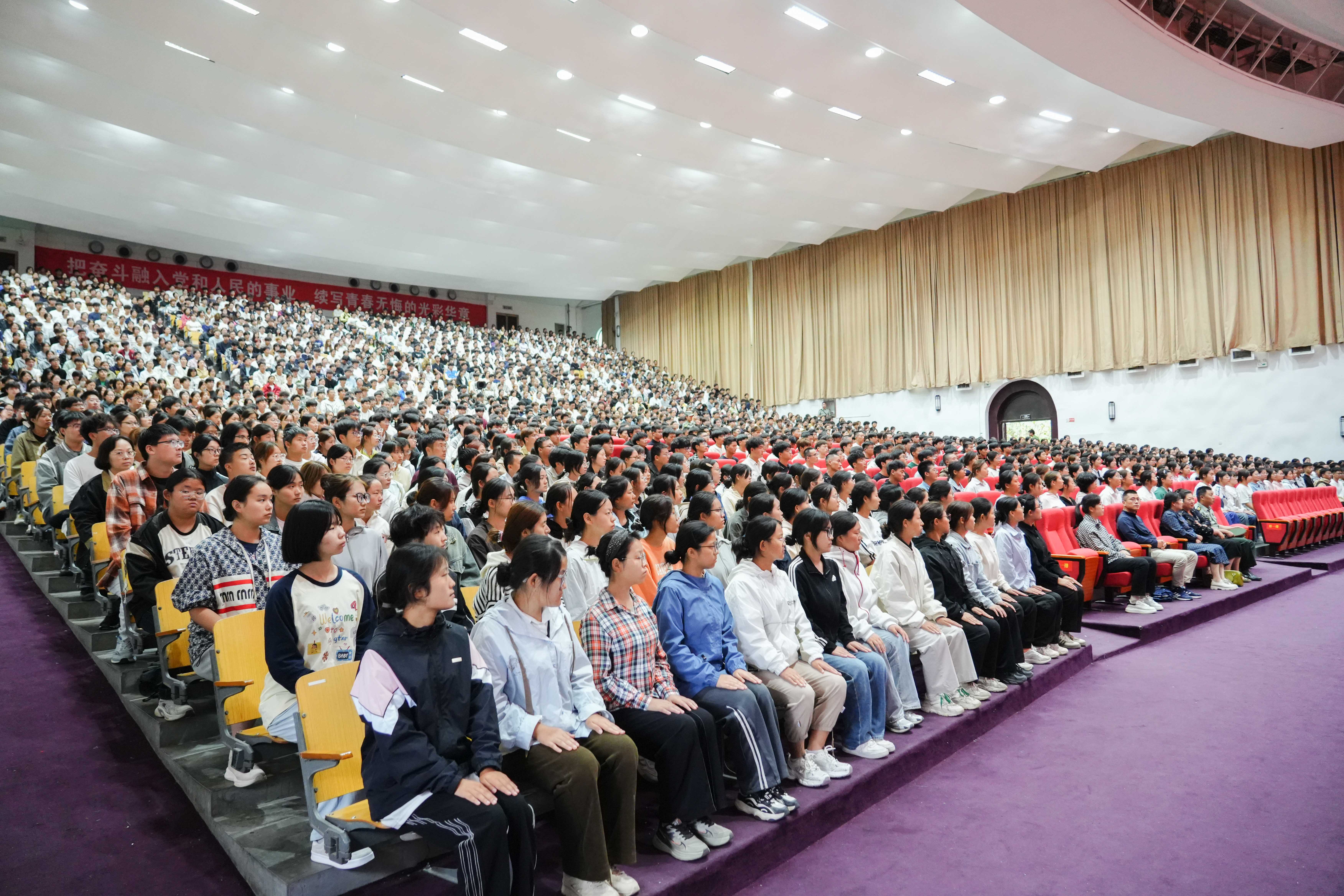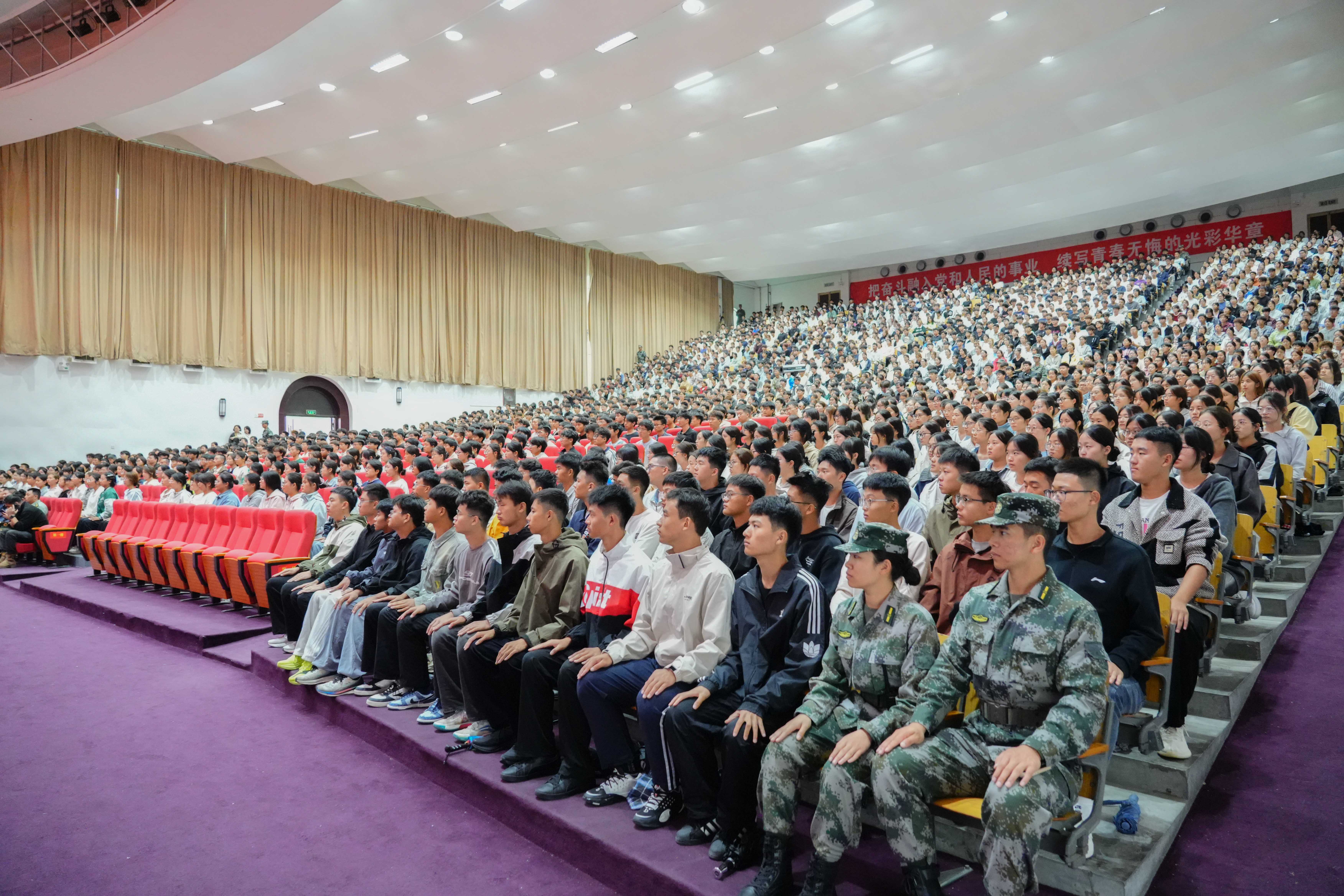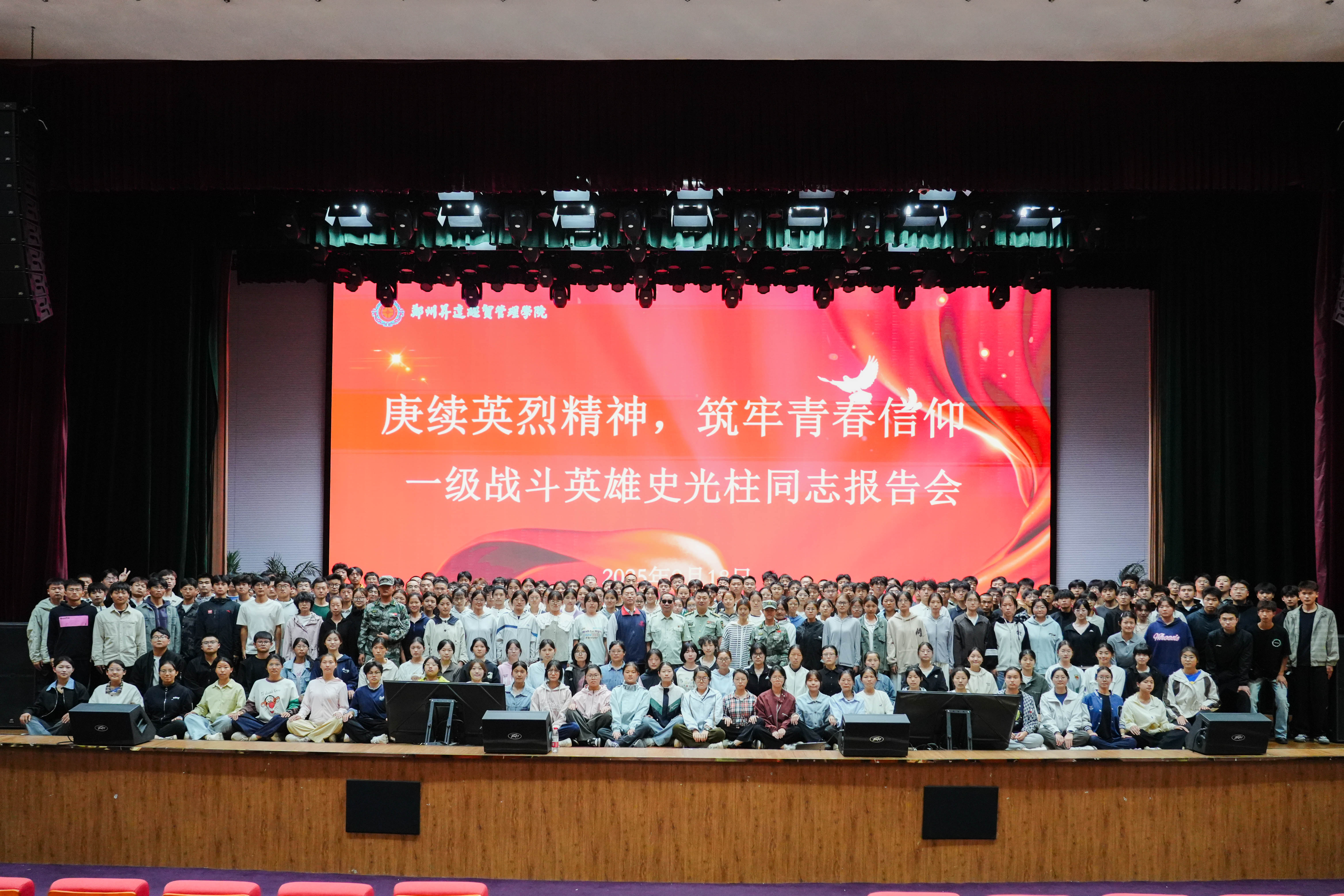 9月18日,一级战斗英雄史光柱同志在我校思源会馆为2025级军训新生带来《奋斗正青春》主题报告会。新郑市委常委、武装部上校政委杨兆鹏,校党委副书记、副校长张金安,校党委委员、学工部长兼武装部长张红阳出席报告会,各学院党委副书记、武装部全体职员、2025级新生辅导员、全体军训教官、新一届校“尖兵连”、国旗班成员及两千余名新生参加报告会。