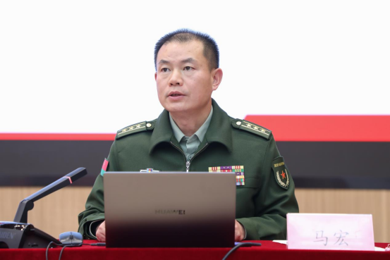 马宏作主题演讲,他从国防缘起、国防必要性、高校如何做好国防、大学生参军入伍四个方面内容为全体参会人员带来一场两个小时的分享。他从国防的概念讲起,以宋、清两朝历史脉络基础,剖析了强大国防对于国家建设的重要性;系统的结合目前的俄乌战争、巴以冲突等时事热点,剖析了国防建设的必要性;从自身军旅生涯截取汶川抗震的经历,讲述普通群众和高校如何做好、搞好国防建设;最后结合有关国防建设的法律法规,以国家给予军人的荣誉和优惠政策号召参会的毕业生参军入伍,投身军旅,献身国防事业。两个小时的课程以“国”字释义开始,结合历史、时事、法规、自身经历等内容,课程详实、系统。会议结束后,马宏调研了我校武装部国防预备团建设情况。他详细了解了我校国防预备团建制、装备配备和训练情况,对我校国防预备团的专业性建设给予了高度评价。调研结束后,他对国防预备团成员讲道:“大家训练很辛苦、成绩也很突出,虽然你们尚未入伍,但基本军事素养和精神风貌已经十分过硬,值得大力表扬”。同时他希望预备团成员能够再接再厉,严格按照士兵的标准要求自己,听党指挥,既做训练员,又做宣传员,按照学校武装部的要求,开展好国防宣传与征兵动员工作,都能顺利入伍。