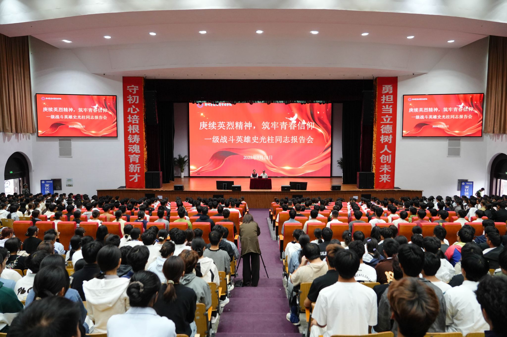 9月18日,一级战斗英雄史光柱同志在我校思源会馆为2025级军训新生带来《奋斗正青春》主题报告会。新郑市委常委、武装部上校政委杨兆鹏,校党委副书记、副校长张金安,校党委委员、学工部长兼武装部长张红阳出席报告会...