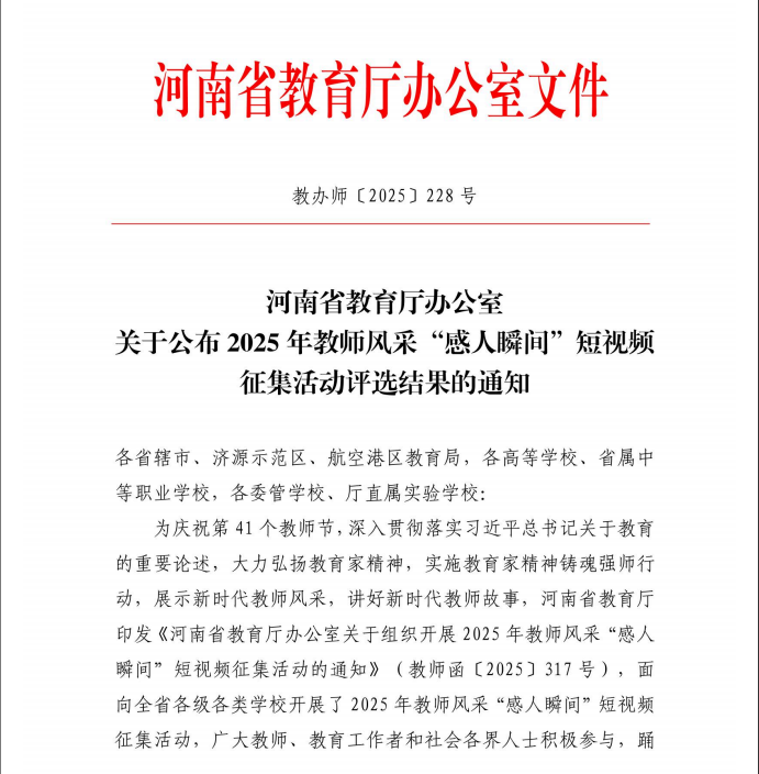 近日,河南省教育厅办公室公布《2025年教师风采“感人瞬间”短视频征集活动评选结果》(教办师〔2025〕228号),我校选送的1个短视频作品获三等奖。