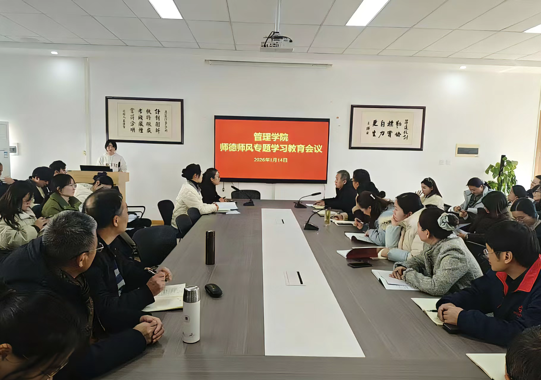 1月14日上午,管理学院在2号楼209室召开师德师风专题学习教育会。学院党委书记职正路、院长朱影影带头领学,全体教职工参加学习。