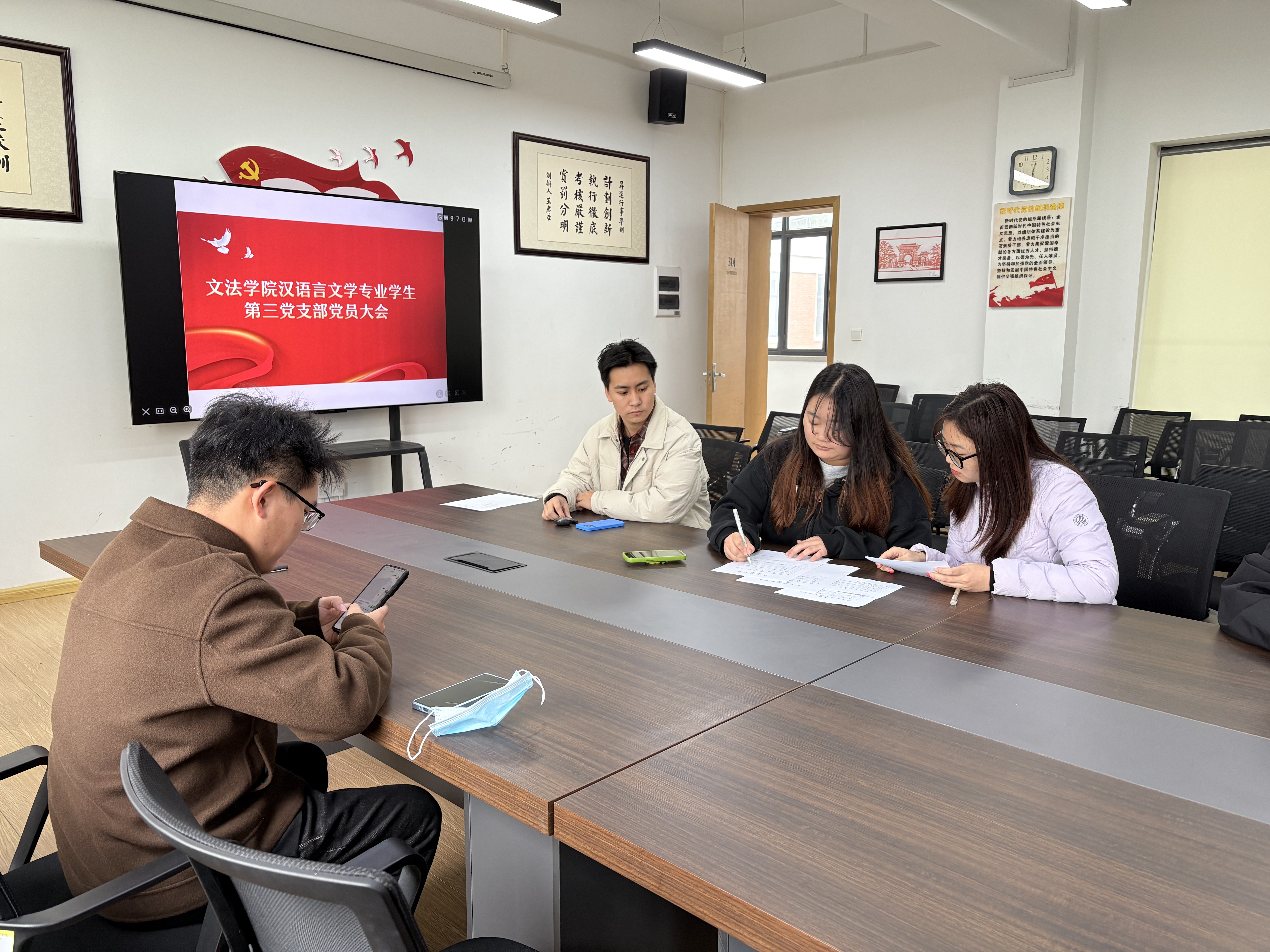 为深入贯彻落实新时代党的建设总要求,强化汉语言文学专业学生思想政治引领,突出文学学科在红色文化传承中的独特优势,充分发挥学生党员在青年群体中的先锋模范作用,10月20日,在文法学院314会议室举行汉语言文学专业学生第三党支部成立大会。汉语言文学专业辅导员及全体学生党员共7人参会。