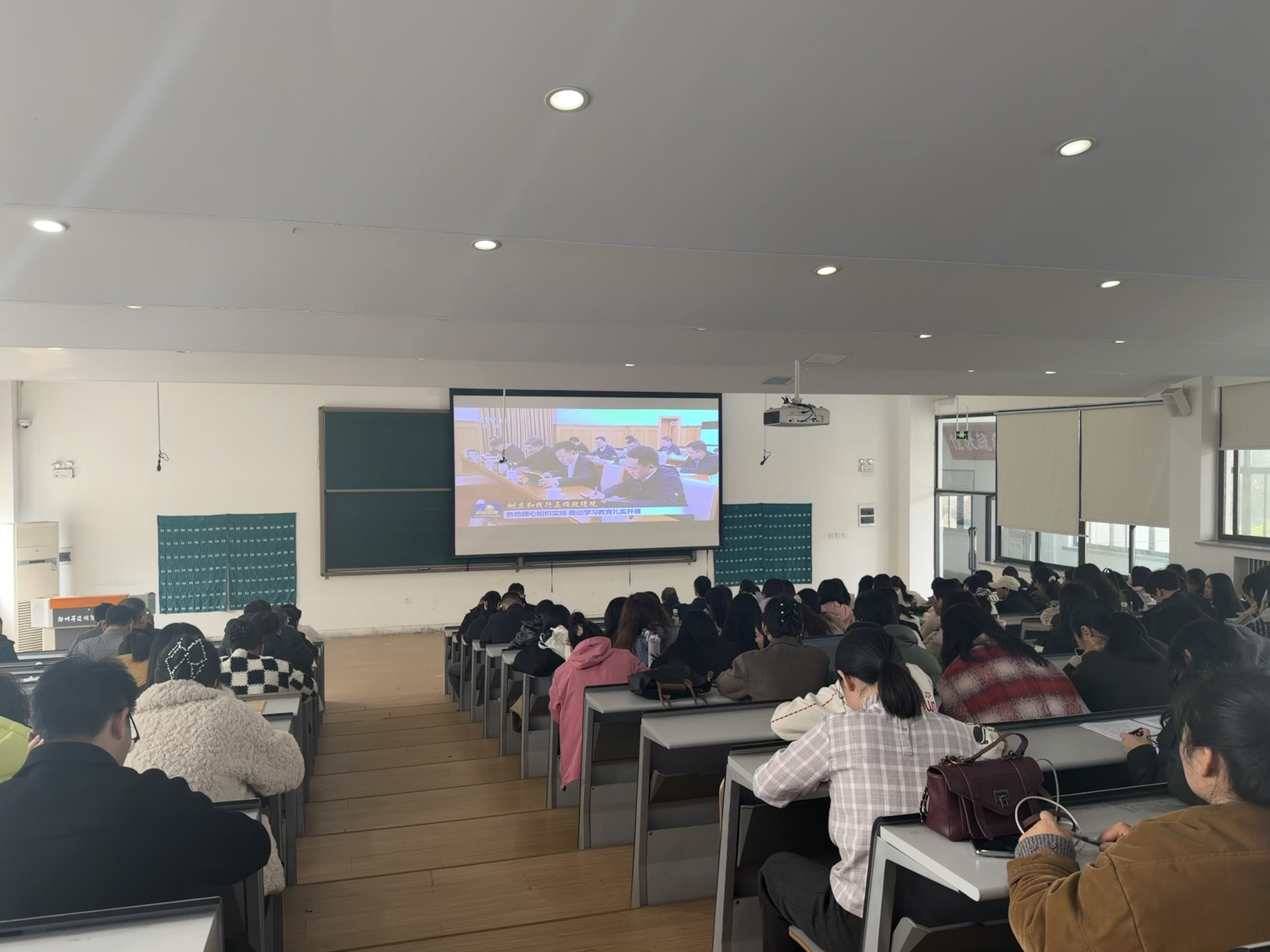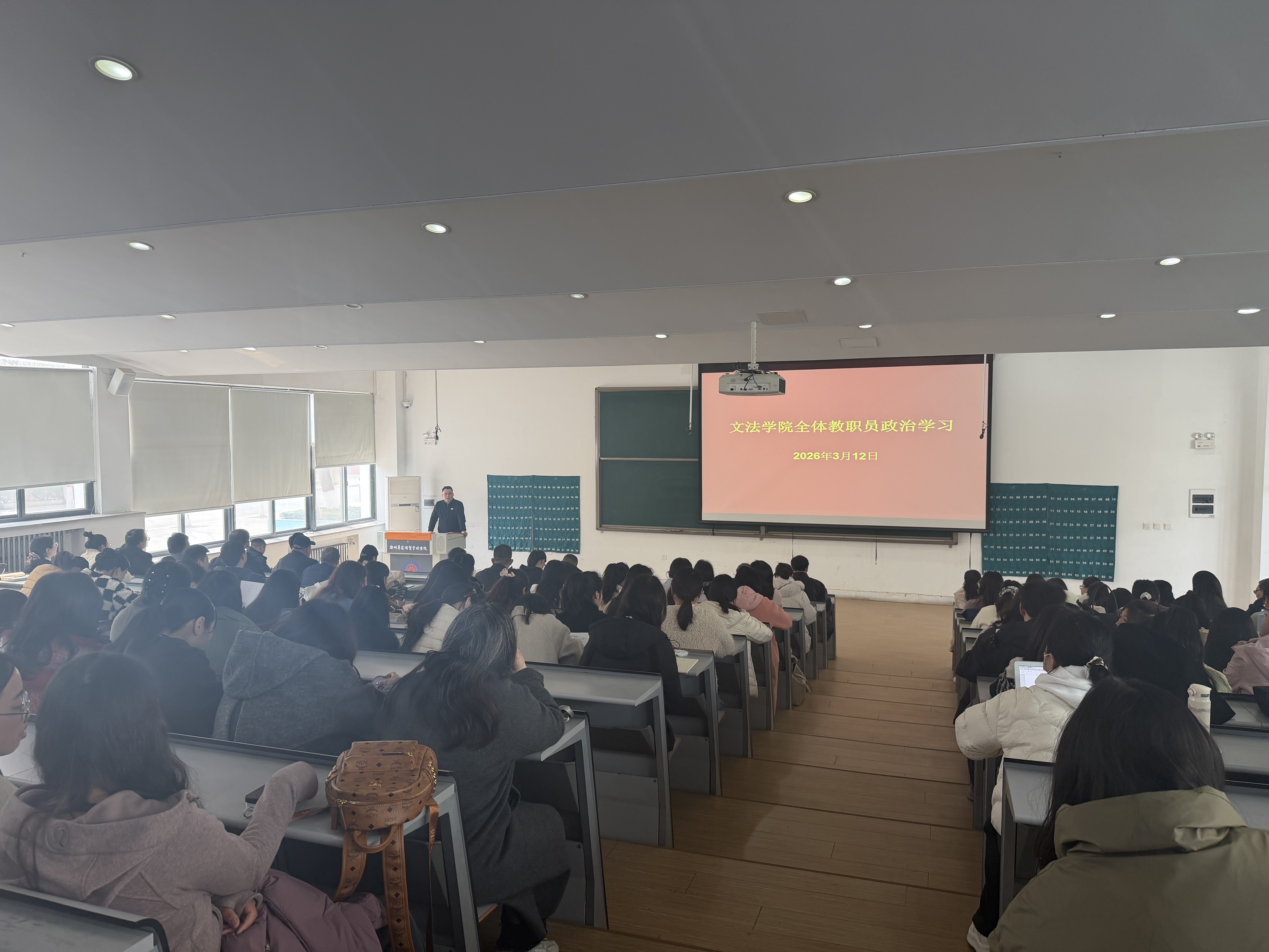为持续深化理论武装,全面落实立德树人根本任务,3月12日下午,文法学院在教学1号楼118教室组织全体教职工进行政治学习。
