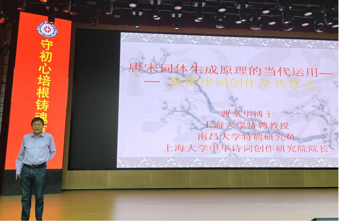 2025年10月15日,文法学院邀请上海大学博士生导师曹辛华教授在图书馆三号报告厅举办了一场题为《唐宋词体生成原理的当代运用——新格律词创作及其意义》的精彩讲座,汉语言文学专业部分教师与数百名学生积极参与。此次讲座由文法学院副院长赵严俊主持。