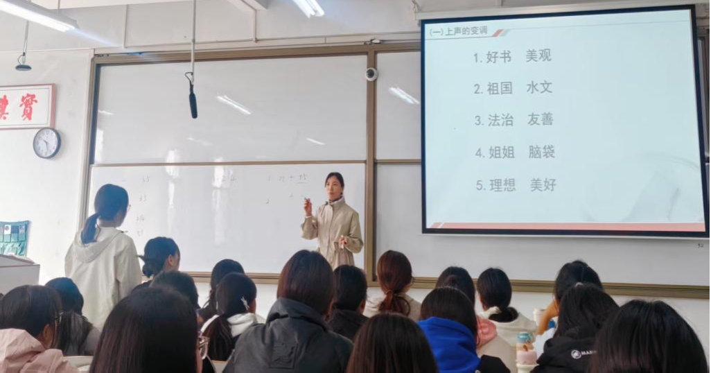 王敏凤教授课堂上秉持“以学生为中心,以产出为导向”的教学理念,在课堂教学设计与实施中,充分尊重学生的认知规律和学习需求,思政要素更是如春雨般润物无声地贯穿整节课,以“博学、审问、慎思、明辨、笃行”这一经典治学理念作为教学主线,从语音知识的导入到音变规律的探究,再到实际运用的拓展,每个教学环节都与主线环环相扣。思政融入自然而不生硬,例如在讲解上声的音变现象时,她结合日常生活交流和习近平总书记的讲话等用例,通过对比不同发音带来的表达效果差异,不仅让学生轻松掌握了音变规则、实现规范发音,更让大家深刻地感受到了音变所蕴含的汉语韵律之美与表达之妙,进而强化了推广国家通用语言文字、传承中华优秀语言文化的责任意识。