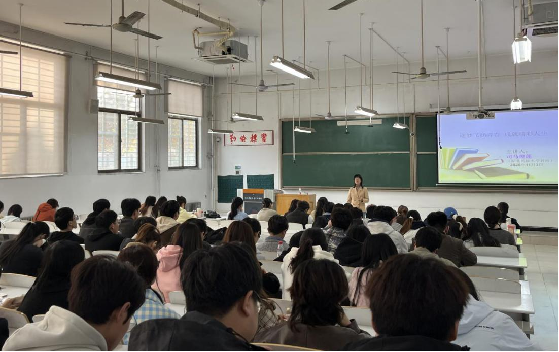 2025年11月3日下午,文法学院在时金楼107教室举办了一场主题为“逐梦飞扬青春 成就精彩人生”的专题报告。本次报告特邀湖北民族大学民族法学院教授、硕士研究生导师司马俊莲主讲。