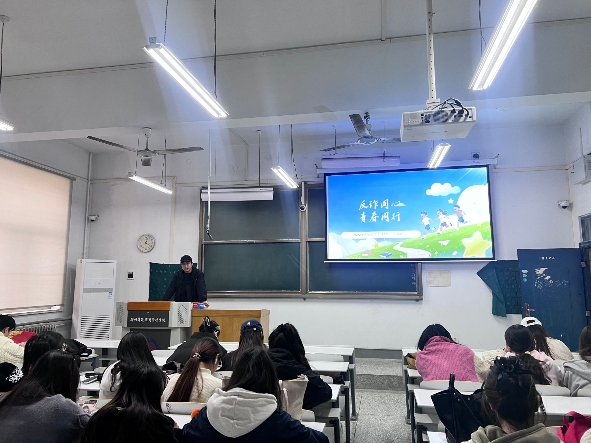 为进一步提升青年学生的反诈防骗意识,筑牢校园安全防线,2024级新闻学本科1班团支部于11月10日在综合大楼124教室开展“反诈同心青春同行”主题团日活动。活动由团支书皮帅主持,2024级新闻学本科1班团支部全体学生参加此次活动。
