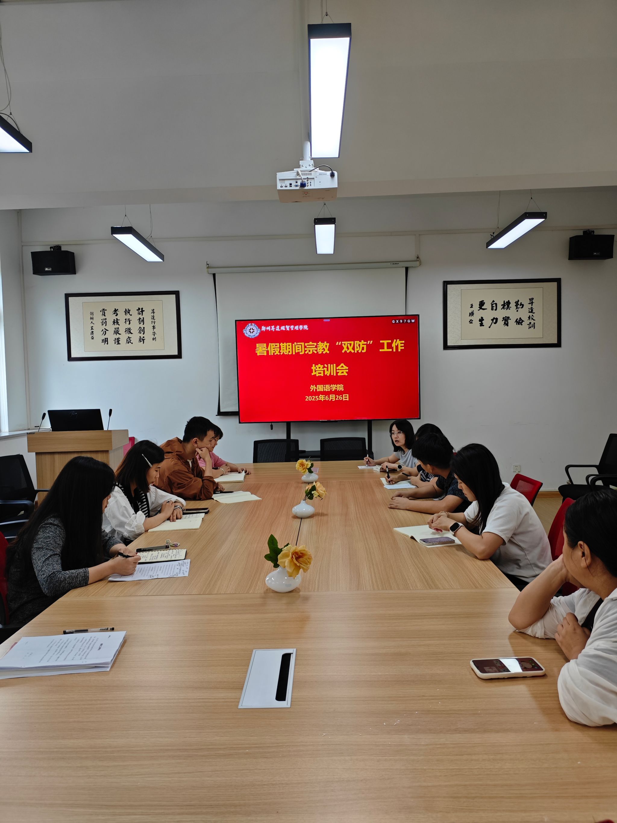 2025年6月26日,外国语学院在院会议室召开暑假期间宗教“双防”工作培训会,会议由行政秘书丁玥老师主持,全体辅导员和学院统战专员参加会议。