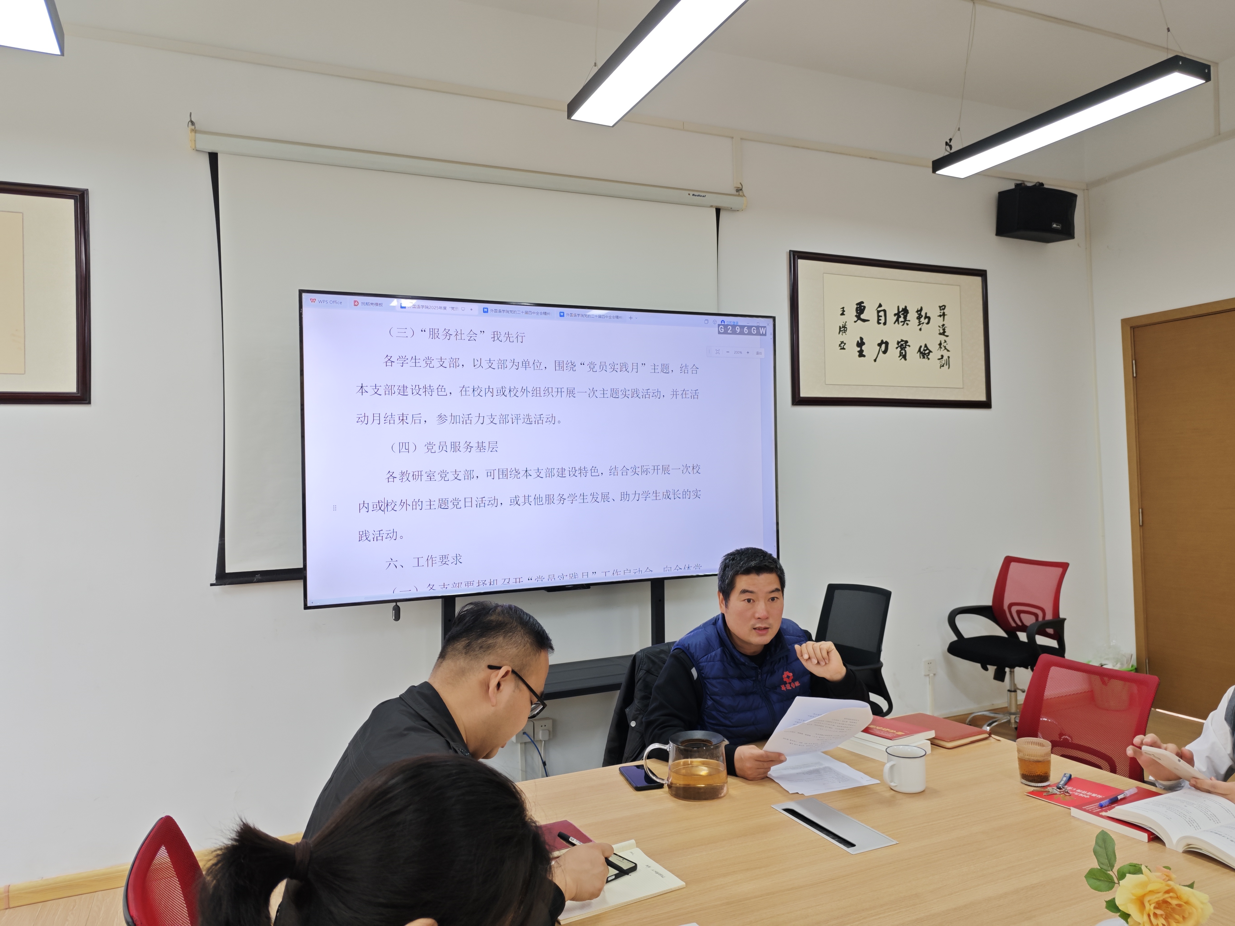 会议首先聚焦学院2025年“党员实践月”活动开展。由石书记详细介绍了活动方案,活动于11月1日至30日开展,面向全院师生党员、培养对象和积极分子。活动设置“推动发展‘五带头’”,涵盖提升工作质量、规范教学管理等;“形象展示‘五标杆’”,涉及礼仪、秩序等方面;还有“服务社会”实践与党员服务基层活动。各支部要召开启动会、做好宣传,学院将提供经费等保障。