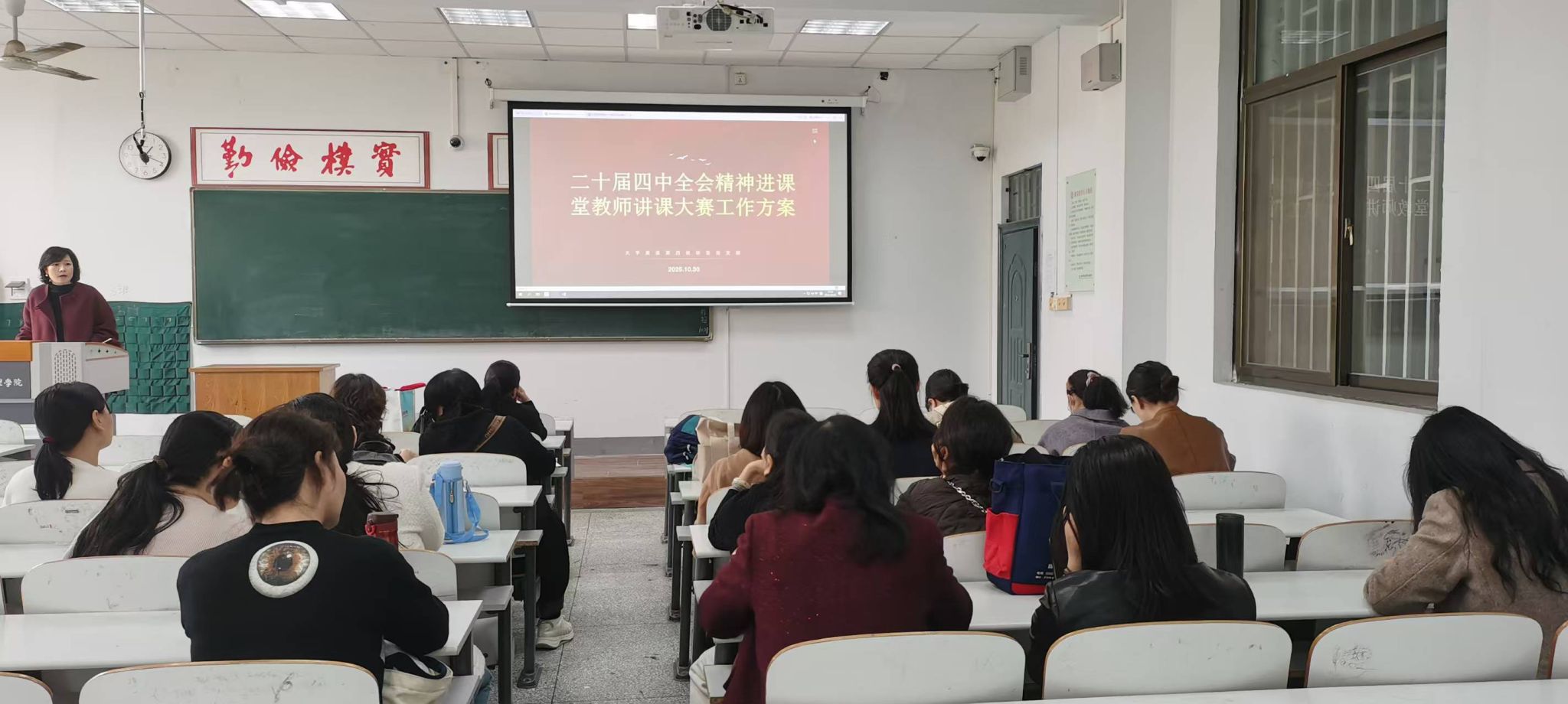 随后,会议针对党的二十届四中全会精神进课堂教师讲课大赛工作方案展开了深入讨论。明确了大赛的宗旨是推动党的二十届四中全会精神更好地融入课堂教学,通过讲课大赛的形式,促进教师们深入研究如何将全会精神与英语教学内容有机结合,创新教学方法,提高教学质量,落实立德树人根本任务。