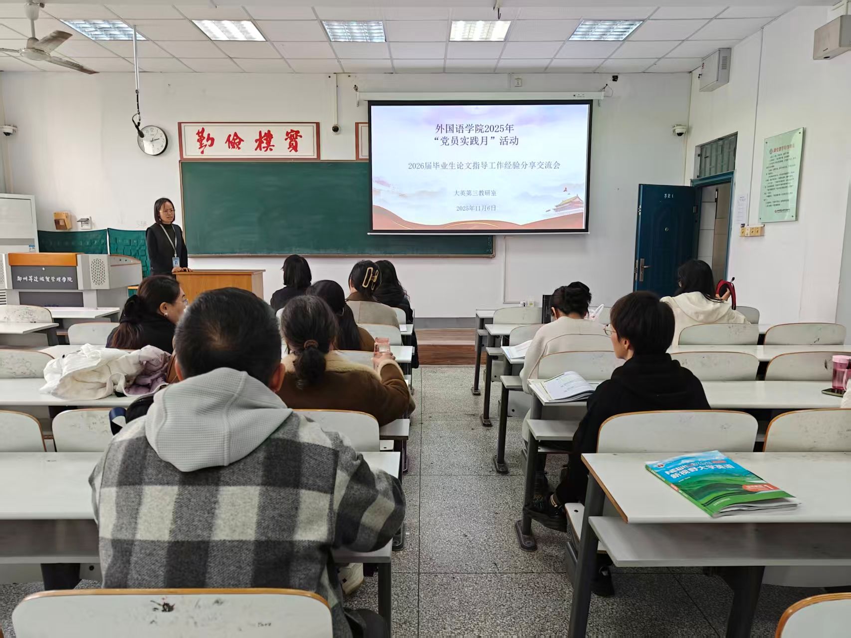 郑州升达经贸管理学院外国语学院大英第三教研室党支部在2025年“党员实践月”期间,围绕学院2026届毕业生的论文指导工作,以“集中专题讲座+分散答疑解惑”的方式,进行了多模态、高频次的经验分享和交流,以期为本轮论文指导工作的顺利展开保驾护航。