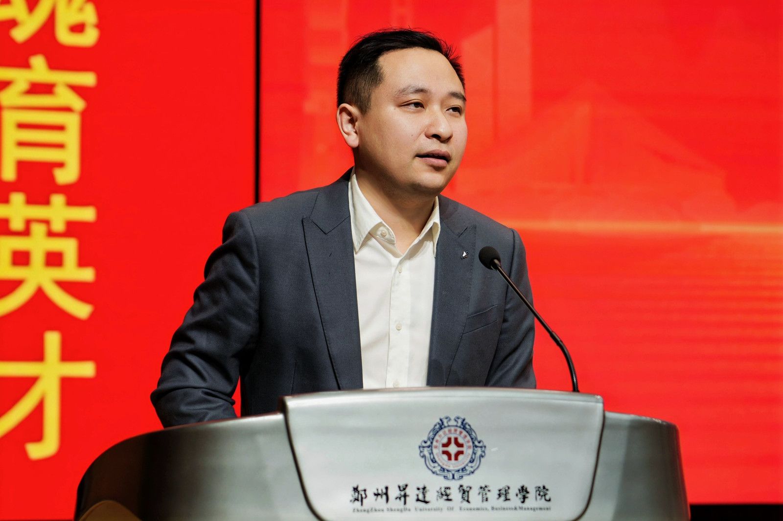 陈庆峰讲话,他表示,“外研社・国才杯”“理解当代中国”河南省大学生外语能力大赛以“理解中国、沟通世界”为主题,精准锚定时代需求,为广大学子搭建了一个展示外语能力、交流文化理解、锤炼国际视野的卓越平台。他提出三点希望,一是希望各位选手以赛促学,提升外语综合素养;二是希望各位指导教师以赛促教,深化教学改革创新;三是希望各承办单位以赛促建,凝聚协同育人合力。他祝愿各位选手把握参赛机会,赛出风格、赛出水平,与优秀朋辈交流切磋、相互学习、共同进步,充分展现我省学子奋发向上的精神风貌,展现当代中国青年胸怀天下的青春之姿;希望各位专家评委坚持公平、公正、公开原则,严谨评审选手的参赛表现,不吝点评和建议,为我省选拔出更高水平的选手亮相全国决赛;希望各高校锚定教育强国的目标,进一步提升外语人才自主培养能力,深化“外语+”复合型人才培养模式,推动数智技术与外语教学深度融合,共同为推动中国更好地走向世界、让世界更好地理解中国贡献更大力量!