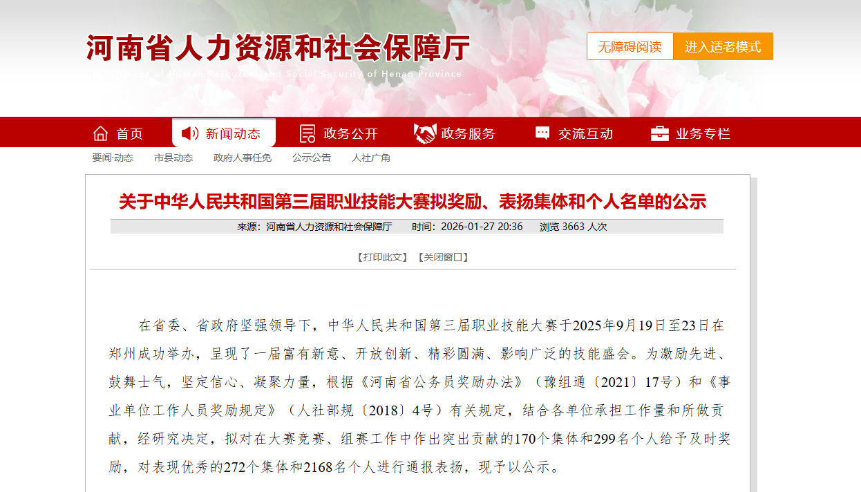 为表彰先进、树立典范,进一步激发全省上下特别是广大干部职工投身技能强国建设的积极性、主动性和创造性,河南省人力资源和社会保障厅于1月27日公示了关于中华人民共和国第三届职业技能大赛拟奖励、表扬集体和个人名单。在备受瞩目的表彰名单中,我校因其在赛事相关工作中的卓越贡献,被拟授予记功奖励。同时,我校董事长王新奇、校长张欣被列入个人表扬名单。这标志着我校在服务国家重大技能赛事、参与高水准技能人才培养与交流平台建设方面所做的努力获得了高度认可。