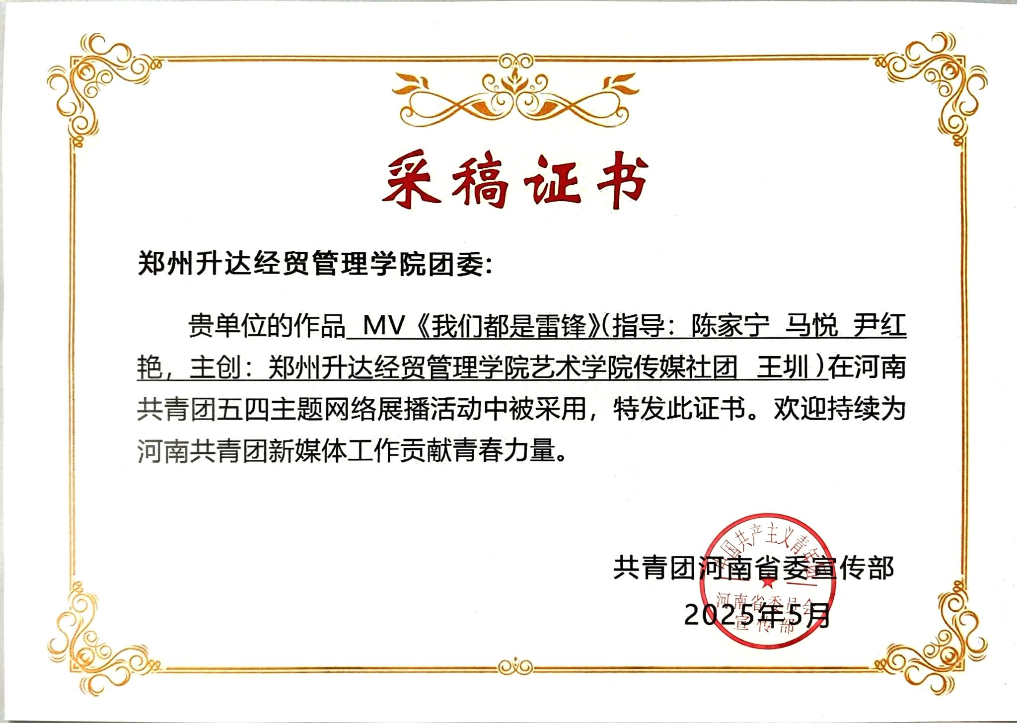 近日,共青团河南省委宣传部正式颁发“河南共青团五四主题网络展演活动”采稿证书,由我校艺术学院传媒社团精心创作的MV作品《我们都是雷锋》成功入选展播。该作品以青春视角生动诠释雷锋精神,展现了我校学子扎实的专业能力与深厚的家国情怀。