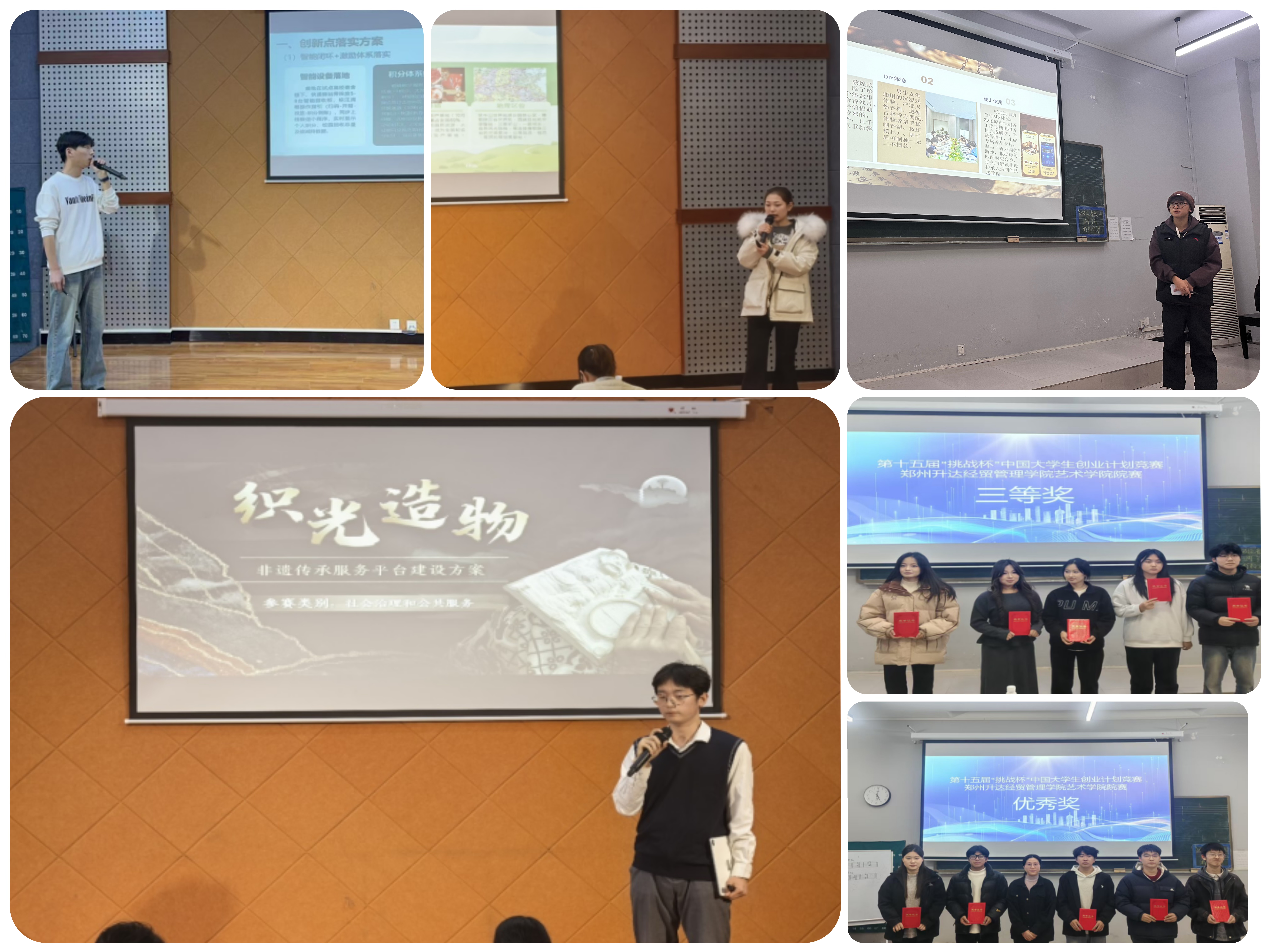 本次院赛入围的21个项目涵盖AI技术、非遗传承、乡村振兴、生态保护等多个领域,展现了艺术学院在跨学科融合创新中的独特优势。因为比赛队伍比较多,赛事以打磨项目为主。本次院赛分2天开展。12月4日下午105教室开展科技、乡村振兴、社会治理相关项目赛事。科技创新赛道上,“医”览无余——老人的Ai药物管理师项目引人注目。团队利用AI算法与物联网技术,设计智能药盒与健康监测系统,实现用药提醒、剂量控制、健康数据实时反馈等功能,为独居老人用药安全提供“智慧守护”,体现了科技向善的人文关怀。乡村振兴赛道成为亮点聚集区。“艺启乡未来”项目以美育为切入点,通过在乡村小学开设美术、音乐等特色课程,培养乡村儿童审美素养,同时联动村民创作乡土文创产品,激活乡村内生动力;“小碟子”转动“大舞台”项目聚焦商丘非遗“碟子舞”,团队深入商丘乡村调研,将传统舞蹈与现代编创结合,开发文旅演出、短视频推广、文创周边等产品矩阵,让非遗“活”起来、“火”起来,助力乡村文化振兴;“古院数字资产OS”则通过三维建模、数字孪生技术,为古村落建筑建立数字档案,打造“线上游览+线下体验”的乡村旅游新模式,为传统村落保护与开发提供“数字方案”。“伏牛山生态养生谷”乡村振兴综合体计划用数字媒体技术赋能乡村振兴实业。社会治理赛道充满温情与创新。“舞悦夕阳”项目针对老年群体设计融合舞蹈治疗与心理疏导的服务体系,通过编排适老化舞蹈动作,帮助老年人改善身体机能、缓解孤独感;“声·生不息”项目聚焦特殊儿童音乐疗愈,团队联合音乐治疗师开发个性化课程,用音乐打开特殊儿童的“心灵之窗”;“职业启蒙+”项目则面向新职业青年,构建社区化、场景化技能提升平台,通过“线上课程+线下工坊”模式,助力青年掌握短视频制作、直播运营等新兴技能,拓宽就业渠道。12月5日上午在艺术楼104教室开展科技、乡村振兴、社会治理相关项目赛事。生态文明赛道上,“艺塑绿潮”项目以美育为纽带,设计绿色消费主题文创产品与沉浸式展览,引导公众树立低碳生活理念;“盒”筑零碳校园项目则从快递纸盒回收利用切入,通过创意设计将废纸箱转化为校园景观装置、文创手作等,实现“废纸变宝”,探索校园碳减排量化实践新路径。文化创意赛道彰显“豫文化”传承创新活力。“智筑元境·豫脉相传”项目运用AI与元宇宙技术,构建豫剧祥符调虚拟演出场景,观众可通过VR设备“身临其境”感受传统戏曲魅力;“豫韵新生·空间赋章”团队则聚焦民俗文化空间设计,将河南剪纸、泥塑等非遗元素融入乡村民宿、社区公共空间改造,打造“可触摸、可体验”的文化载体;“豫人豫语”河南文化漫游小程序整合全省文旅资源,以“语音导览+互动游戏+文创商城”模式,让用户“一键解锁”河南历史文化与民俗风情,成为传播中原文化的“数字名片”。