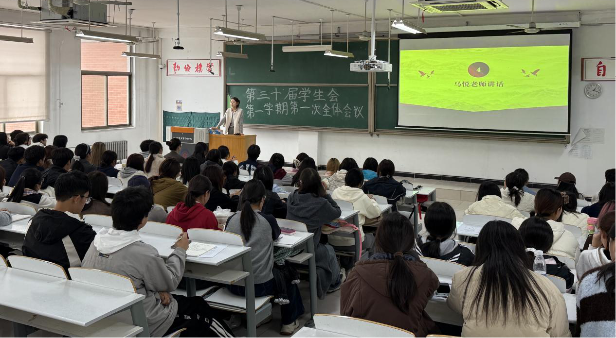 最后,校学生会指导老师马悦发言,她从"总结经验,平衡时间,及时汇报,按时完成,互相尊重"四个方面来开展,对之后工作进行了细致的规划,表达了对新生及留任学姐学长的期望。