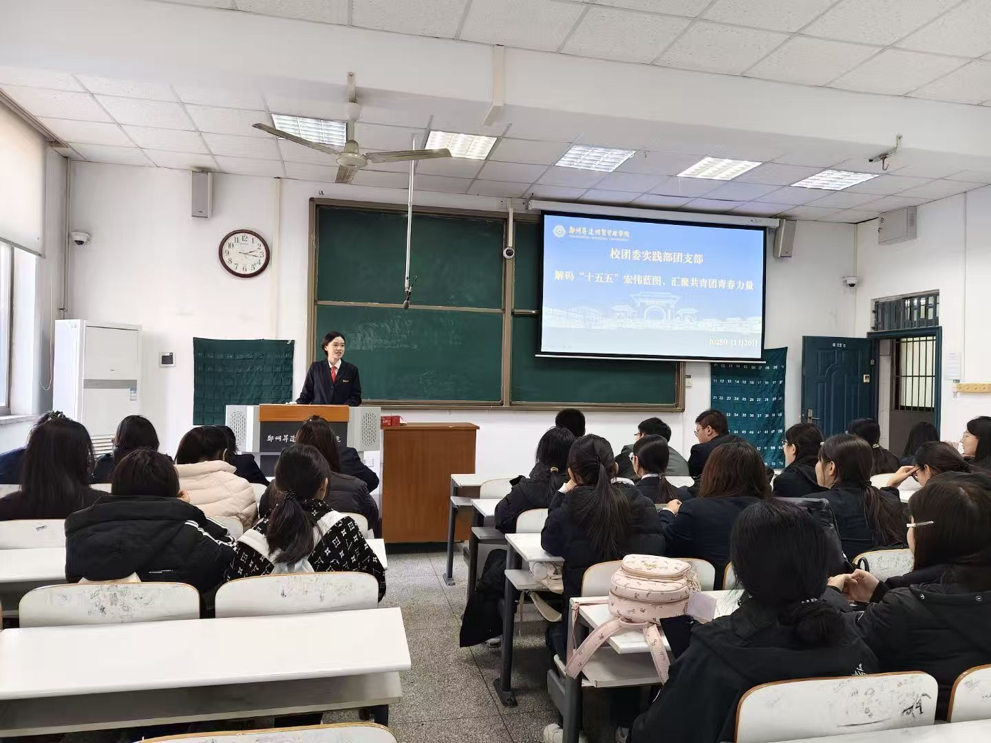 为引导广大团员青年深刻领会国家发展战略,明确新时代青年的历史使命与奋斗方向,激发投身强国建设、民族复兴伟业的青春热情,按照本学期主题团日活动安排,校团委实践部团支部于11月20日在综合楼220室和明德讲坛举办“解码‘十五五’宏伟蓝图,汇聚共青团青春力量”主题团日活动。团支部全体成员参加了本次活动。