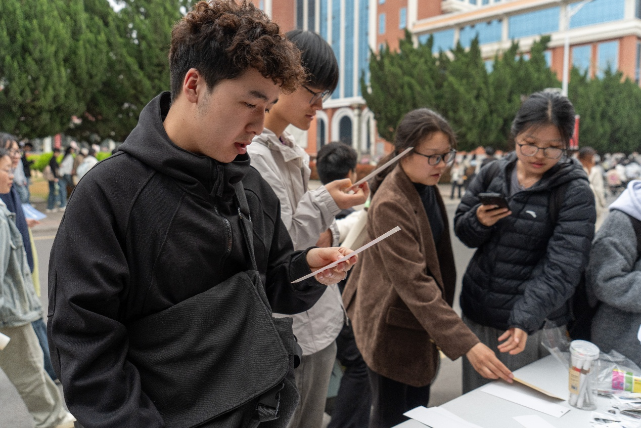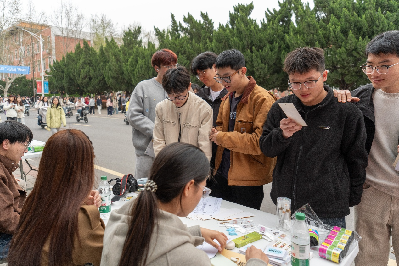 活动现场精心布置了春日主题装饰,氛围清新温馨。活动设置低、中、高三级难度谜题区域,内容涵盖文学常识、校园生活、节气风物等多元主题,兼具知识性与趣味性。工作人员全程值守引导,同学们驻足思考、踊跃作答,现场气氛热烈有序。大家在解谜过程中相互交流、分享乐趣,答对谜题后可登记领取精美奖品,收获满满喜悦。