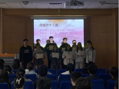 随后进入优秀团学干部与优秀干事表彰环节,部分学生凭借在团学工作中的突出表现荣获“优秀团学干部”称号与“优秀团学干事”称号。获奖代表们依次上台。李明明老师、团总支副书记王宝文、学生会主席贺诗茵依次为获奖代表们颁奖,并进行拍照合影留念。获奖代表们手持荣誉证书,脸上洋溢着自豪的笑容,这既是对他们过去工作的肯定,也是对他们未来继续奋进的鞭策。