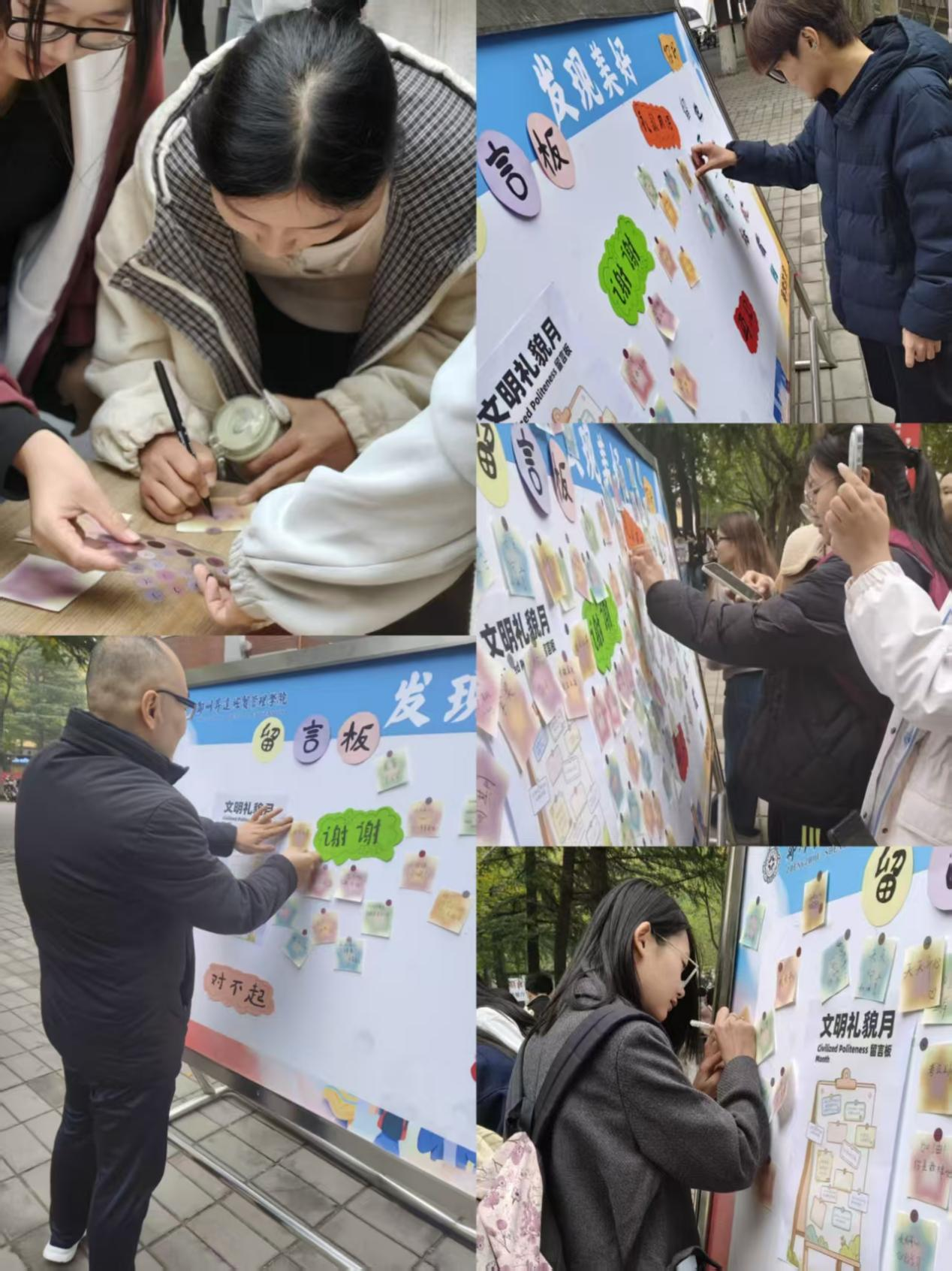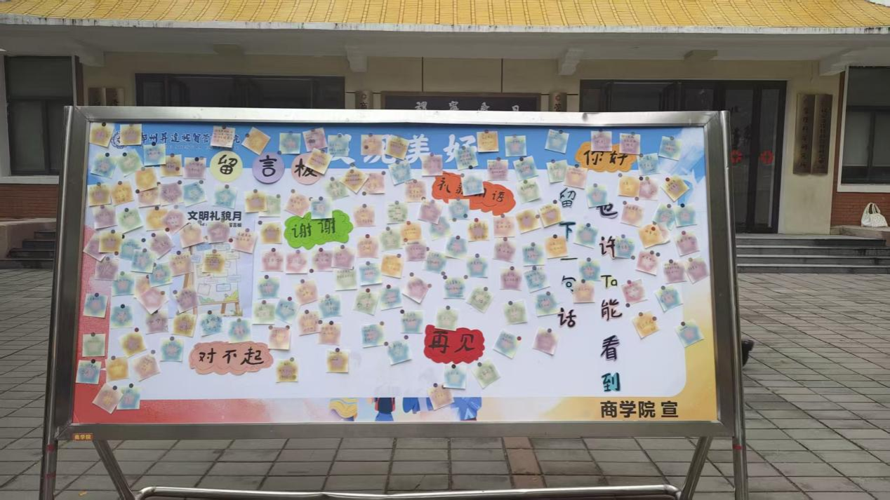 为营造积极健康、明礼友善的校园文化氛围,引导学生关注自我成长与心灵关怀,商学院于2025年10月28日在教学楼2号楼门前成功举办了文明礼貌月系列活动之写下美好便签活动。本次活动由商学院团委学生会联络服务部承办,面向全院学生开展。