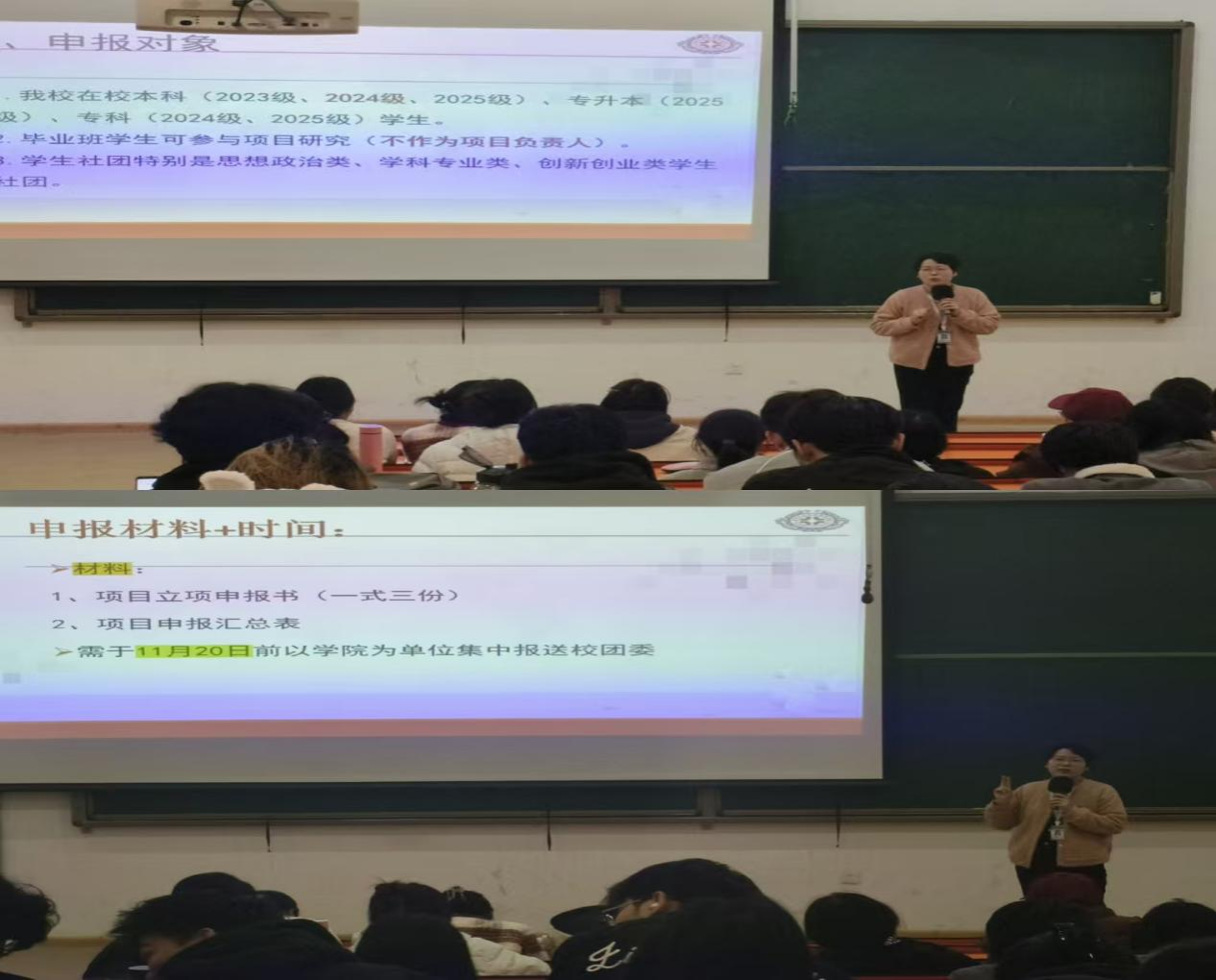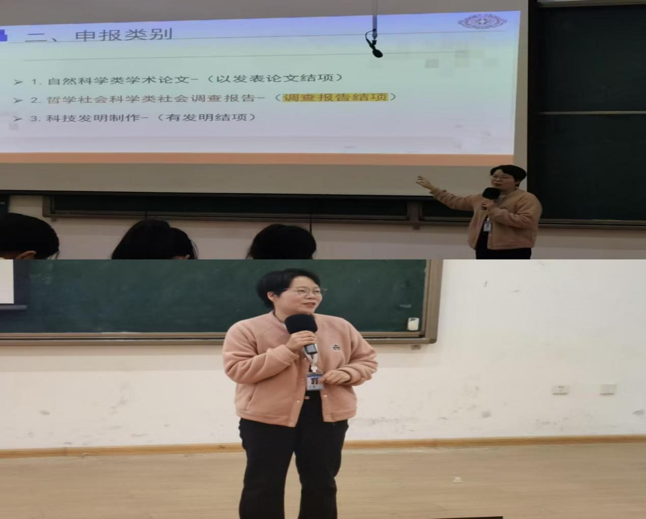 在本次科研项目申报动员会上,董园园老师担任主讲人,围绕科研项目申报的具体细则为参会同学进行了系统讲解。她详细介绍了申报的基本规则,指出本次项目申报不仅支持个人独立申报,也鼓励跨年级、跨专业乃至跨学科组建团队协同攻关,同时明确每位申请人不得在不同项目之间交叉申报。董老师特别强调,参与申报的同学需具备扎实的专业知识、活跃的创新意识和积极的科研热情。她建议申报项目应聚焦学术前沿,兼具探索价值与实践意义,充分体现科学研究的创新性与社会价值。