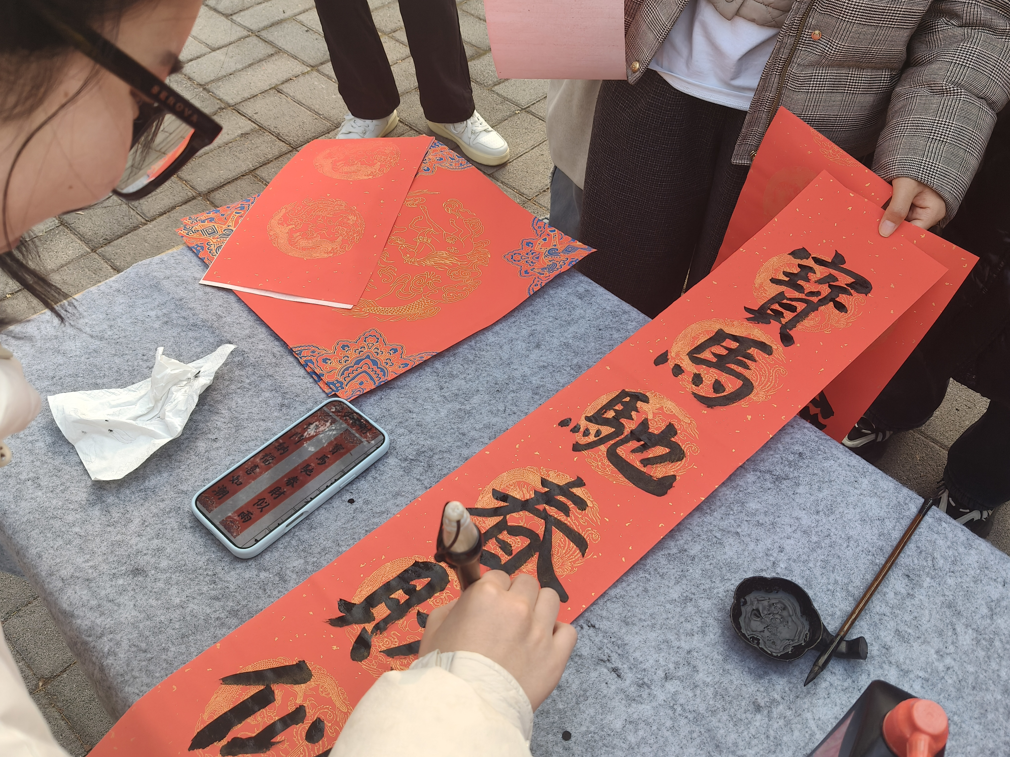 本次活动得到了专业书法力量的鼎力支持,特别邀请到昇光书画社指导老师、中国书法家协会会员卢承华,以及河南省书法协会会员樊朝阳、张开善、金学松三位资深书法家亲临现场。活动伊始,老师们率先提笔示范,笔走龙蛇间,一幅幅寓意吉祥的春联跃然纸上。不同书法家所写的的春联各具韵味,引得现场阵阵赞叹。