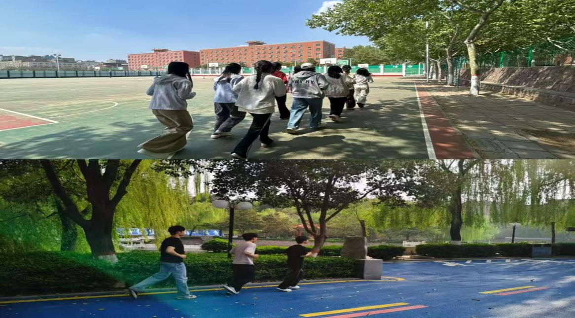 “运动万花筒”环节,同学们分组体验多样运动:女生们开展平衡训练后在操场慢跑一圈;男生前往后山绕湖慢跑,感受低强度有氧运动的魅力。