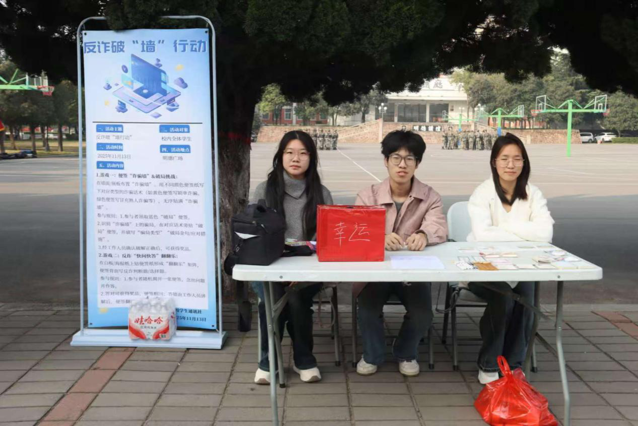 为增强同学们的反诈意识,帮助大家了解犯罪分子的诈骗手段、掌握有效的防诈骗技巧,并明确遭遇诈骗时的应对方法,11月13日,校学生通讯社面向全校学生,在校园明德广场举办了以“反诈破‘墙’行动”为主题的反诈宣传活动。